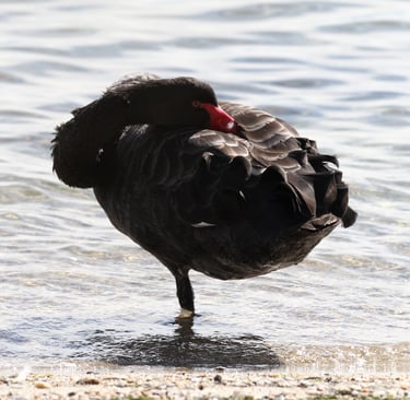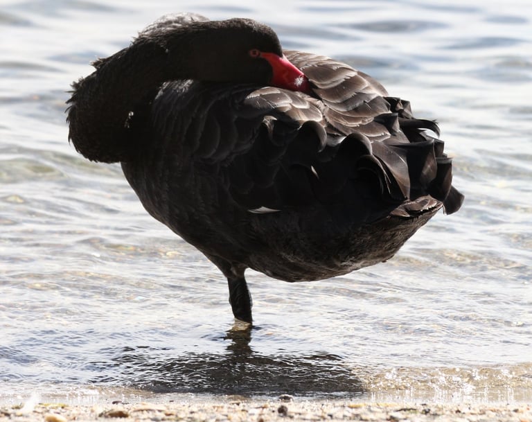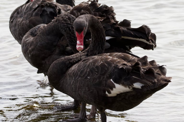 Il cigno nero è un uccello acquatico iconico dell’Australia, noto per il piumaggio completamente nero e le ali bordate di bianco, visibili soprattutto in volo. È facilmente riconoscibile anche per il lungo collo elegante e il becco rosso vivo.