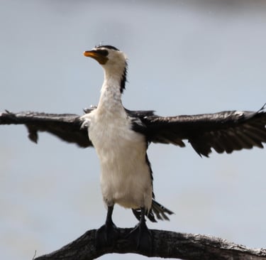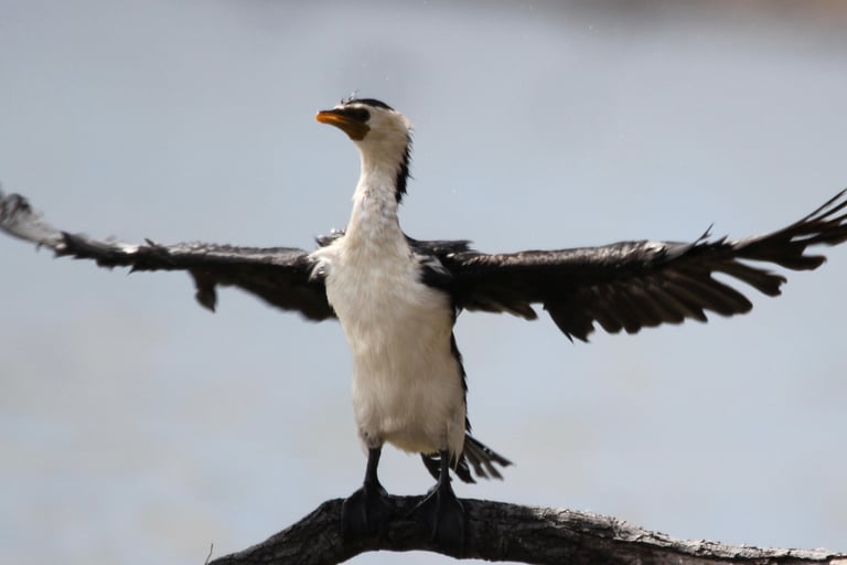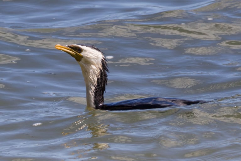 Il cormorano bicolore australiano è un uccello acquatico diffuso lungo coste, fiumi e laghi dell’Australia. È facilmente riconoscibile per il piumaggio nero sulle parti superiori e bianco sul ventre, da cui prende il nome, e per il lungo becco adunco perfetto per catturare pesci.